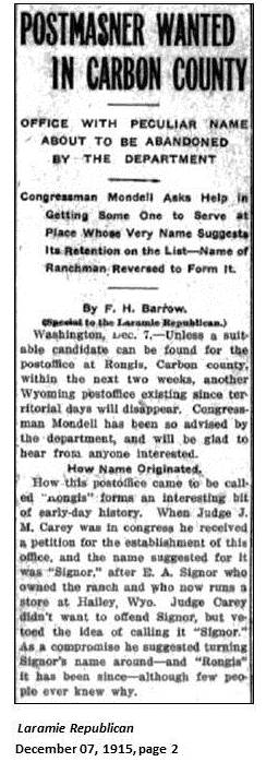 | "How this postoffice came to be called "Rongis" forms an interesting bit of early-day history. When Judge J. M. Carey was in congress, he received a petition for the establishment of this office, and the name suggested for it was "Signor," after E. A. Signor who owned the ranch and who now runs a story at Hailey, Wyo. Judge Carey didn't want to offend Signor, but vetoed the idea of calling it "Signor." As a compromise, he suggested turning Signor's name around and "Rongis" it has been since, although few people ever knew why." (Laramie Republican, December 7, 1915, page 2) The local name for the location is Burnt Ranch. (Wyoming Post Offices) |