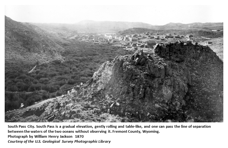 | This is the most celebrated pass of the entire length of the Continental Divide. It is less than 7,500 feet above sea level. It is one of the few passes that is free of timber. The name was virtually given before the pass was discovered. It was long recognized that a pass must be found south of those crossed by Lewis and Clark, and Southern Pass, in contrast to the northern pass, was a term already well recognized. But when that remarkable crossing of the mountains came into use the name fell naturally upon it, and was quickly adopted as South Pass. (WPA) "Saturday, June 21.—Broke camp at 5.30 a. m., in the midst of a driving storm of cold rain, which soon turned into snow, and marched 10.6 miles to the stage-station at Pacific Springs. Here the storm turned into a severe gale of cold wind. Wood, grass, and water at this camp, which is on the northern border of the hot sage-brush plain over which we have been traveling. This vicinity is the "South Pass" of the early geographers, about which there has been so much fictitious writing and picture-making. As there are no mountains about it, and as the old road hardly crosses a hill of any magnitude, the misnomer is evident. The road, however, crosses at this point the divide between the Atlantic and the Pacific flowing waters, and this gave origin to the name." (Jones) |