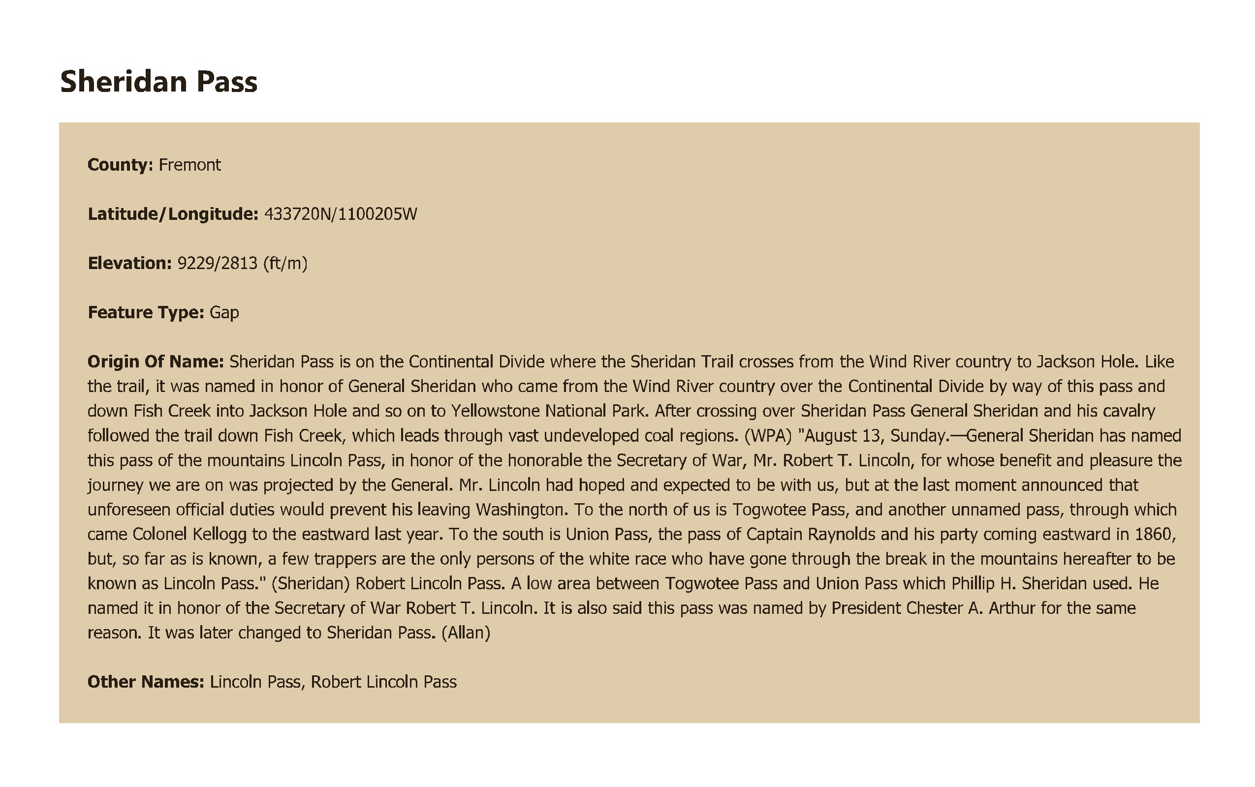 Sheridan Pass is on the Continental Divide where the Sheridan Trail crosses from the Wind River country to Jackson Hole. Like the trail, it was named in honor of General Sheridan who came from the Wind River country over the Continental Divide by way of this pass and down Fish Creek into Jackson Hole and so on to Yellowstone National Park. After crossing over Sheridan Pass General Sheridan and his cavalry followed the trail down Fish Creek, which leads through vast undeveloped coal regions. (WPA) "August 13, Sunday.—General Sheridan has named this pass of the mountains Lincoln Pass, in honor of the honorable the Secretary of War, Mr. Robert T. Lincoln, for whose benefit and pleasure the journey we are on was projected by the General. Mr. Lincoln had hoped and expected to be with us, but at the last moment announced that unforeseen official duties would prevent his leaving Washington. To the north of us is Togwotee Pass, and another unnamed pass, through which came Colonel Kellogg to the eastward last year. To the south is Union Pass, the pass of Captain Raynolds and his party coming eastward in 1860, but, so far as is known, a few trappers are the only persons of the white race who have gone through the break in the mountains hereafter to be known as Lincoln Pass." (Sheridan) Robert Lincoln Pass. A low area between Togwotee Pass and Union Pass which Phillip H. Sheridan used. He named it in honor of the Secretary of War Robert T. Lincoln. It is also said this pass was named by President Chester A. Arthur for the same reason. It was later changed to Sheridan Pass. (Allan)