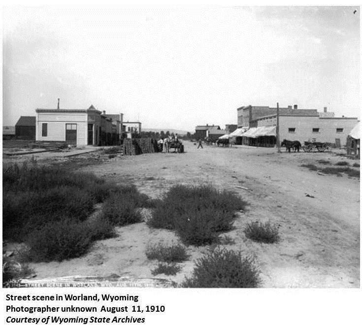 | Named for Charlie Worland who started a saloon, hotel, and little store just south of where the present town now lies. The upstairs of the hotel where the travelers slept was all in one big room. Men, women and children were all put up there together. One night a man and his wife set up their tent in the room and slept in that. Occasionally one traveler would have to wait for someone to get up before he could go to bed and usually he tumbled in without waiting for the bed to be remade. (WPA) Worland Post Office was established on May 22, 1902 with Charles H. Worland as postmaster. (Wyoming Post Offices) |
