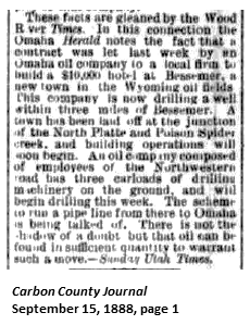Established in 1888, on a plateau north of Bessemer Bend, a scenic section of ranch country for which the town was named. (WPA) Several places ... named for Sir Henry Bessemer, who invented the process of reducing iron ore. (Gannett, 1905)