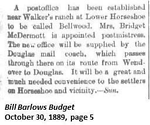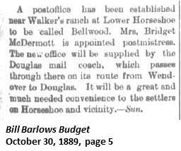"The story of Horseshoe Creek would be incomplete without further mention of Bellewood, a story which is well told by Fred McDermott of Laramie. We came to Wyoming April 28, 1888. Father had preceded us by several years (1882). He later returned to New York for a sojourn of some three years, returning to Wyoming in 1886. There were five children in the family, ranging in age from one and a half to twenty years. Father had located a homestead land entry on a ranch on Horseshoe. The building of the Cheyenne and Northern Railroad, which was done intermittently, from Uva to Wendover in 1887, resumed traffic from that terminal to Douglas. There was no station at Orin at that time. The settlement on Horseshoe Creek and adjacent portion of the Platte River Valley emphasized the need for a post office at this point. It was generally presumed that the post office would be called Horseshoe, but when the late Joseph M. Carey, who was then the delegate to the Congress from Wyoming Territory, visited the ranch while traveling on the newly established stage coach (plying between Wendover and Douglas), he was attracted by my little sister Isabelle, and then and there concluded to name the post office Bellewood. In his official recommendation to the Postmaster General for the establishment of the office, he recommended Mother as Postmaster. There is no such title as Postmistress. Her Commission was signed by President Benjamin Harrison." (Trenholm)