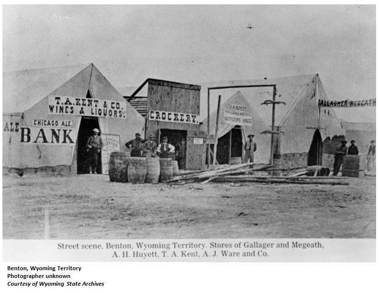 Named for the United States Senator Thomas H. Benton. Benton, located on an alkali flat two or three miles west of Fort Steele (a military reservation at the railroad crossing of the North Platte River) was another railroad tent town that sprang into being in the year 1868. This town was called Benton and like Bear Town, there was a leavening element among its residents, and they later helped greatly in developing Rawlins into a major Wyoming town. During the first few months of Benton's existence, it was a reputed moral replica of Sodom and Gomorrah, with devotees of every form of outlawry. Crime control was absent in Benton. (WPA)