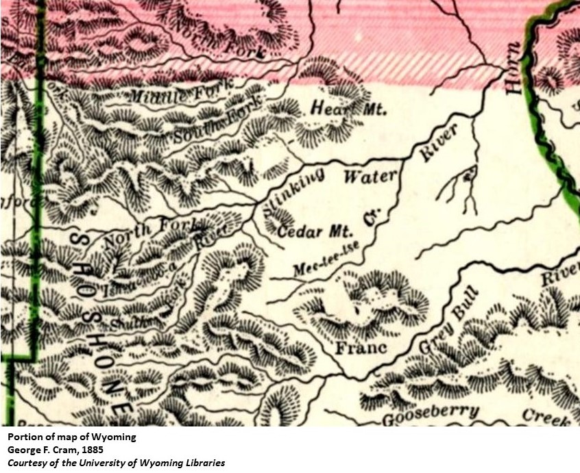 Named Stinking Water River in 1807 by explorer John Colter, due to the odor of nearby sulphur springs. Renamed in 1901 by the Wyoming Legislature and the U.S. Board on Geographic Names, in response to public demand. (Not Stinking Water) (Decisions, 1901) In 1901, the Wyoming Legislature changed the name of the Stinking Water River to Shoshone. (Annals of Wyoming 24:2) The Shoshone River was called "Stinking Waters" in the early days, due to the Maris sulfur springs above Cody. It is well established that John Colter was the first white man to see the Stinking Water River so named by him because of the foul odors from sulfur and other mineral hot springs common along side its course. According to one historian, Colter probably did not go all the way up the Clarks Fork but followed up Dead Indian Creek to the North Fork of the Shoshone, where he detected the odors of the stinking waters. From the North Fork, he proceeded southward up the Elk Fork, thence over into the South Fork via Ishawooa Pass, thence up the South Fork and over the divide into the Wind River Country. From here, he circled northward and made his famous Colter's Hell discovery. (WPA) "The Shoshone project, on which the newly named Buffalo Bill Dam and reservoir are located, was named after the range of mountains and the river which is the source of water for the project. However, the Indians originally gave the river the unattractive name of "Stinking Water" because of the sulphur springs near the mouth of Shoshone Canyon. The Wyoming Legislature, on February 14, 1901, officially fixed the name as Shoshone, after the Shoshoni tribe of Indians. Six weeks later the Board of Geographical Names in the Department of the Interior adopted the name as fixed by the legislature. The reason for changing the last letter of the name from "i" to "e" is not known." ("Speaking of Names" in The Reclamation Era, June 1946, p. 136)