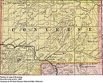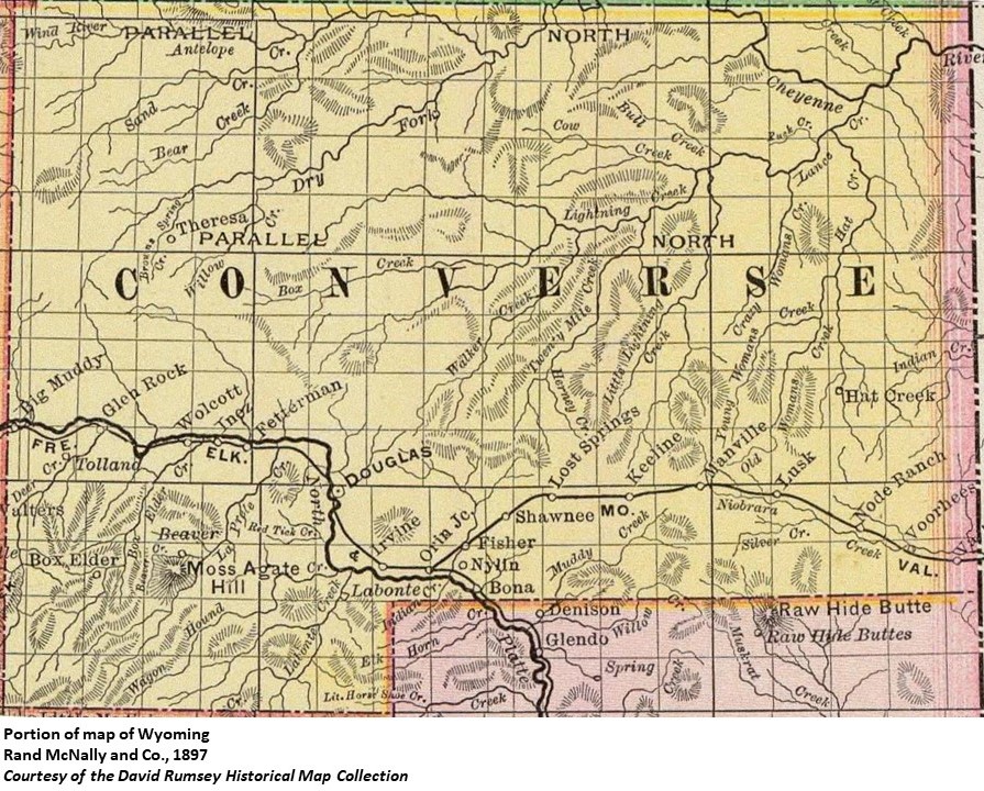 | Creek and town in Converse County, Wyoming, named for La Bonte, an early French trapper. (Gannett) La Bonte, another noted character was of the party and was killed in Utah. La Bonte belonged in Wyoming and had lived for a number of years on the North Platte in what is now Converse County. La Bonte Creek, which flows into the North Platte and La Bonte Station on the old Overland Trail were named after this old trapper. The Indians after killing this noted character, cut flesh from the bones and ate it. (WPA) LaBonte was a trapper with "Uncle Dick" Woolston's party in 1838. (Annals of Wyoming 14:3) |