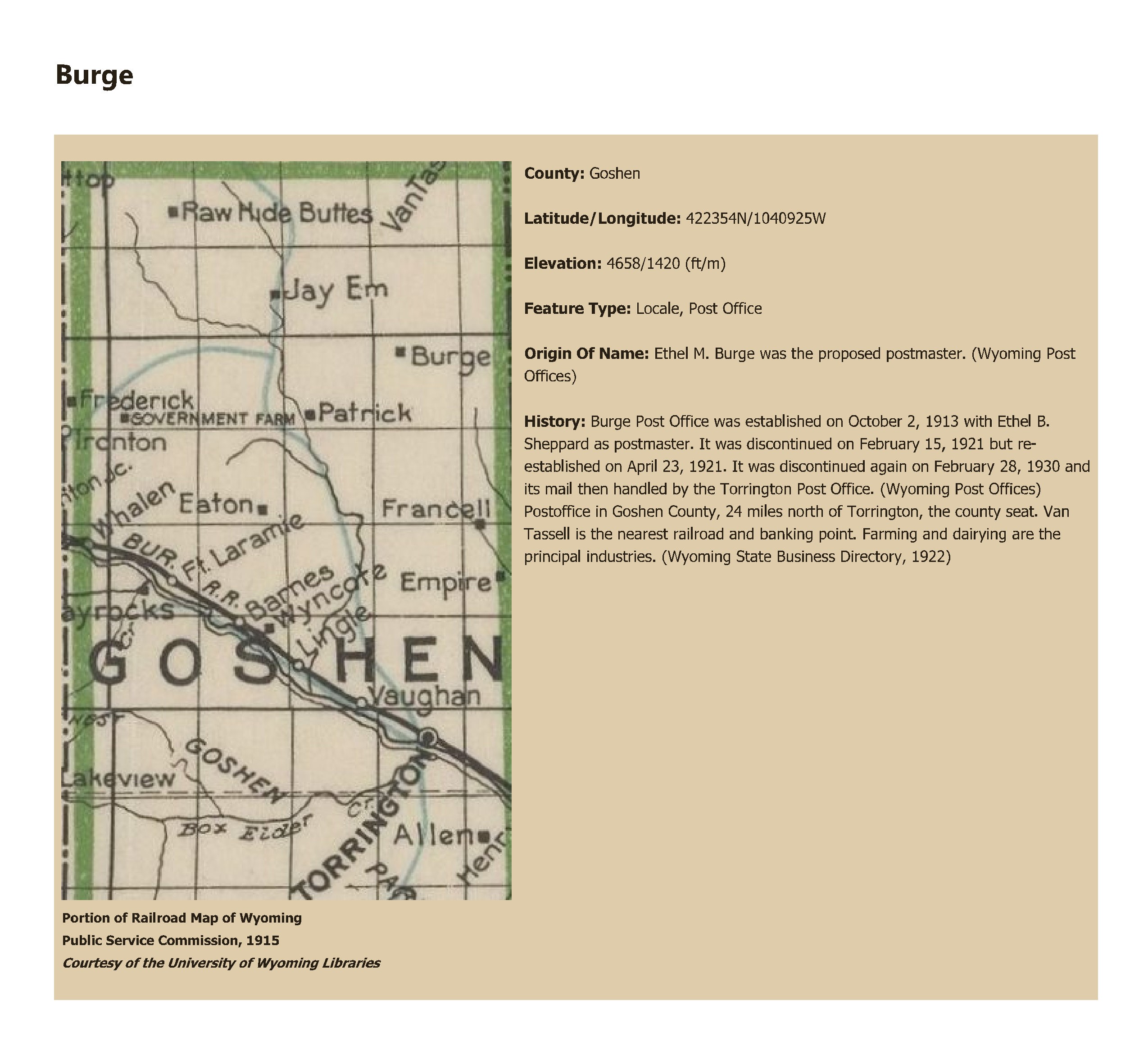 Ethel M. Burge was the proposed postmaster. (Wyoming Post Offices)