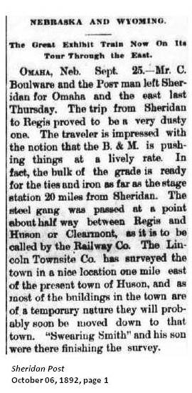 Huson Post Office was established on April 29, 1892 with Edward W. Huson as postmaster. (Wyoming Post Offices)