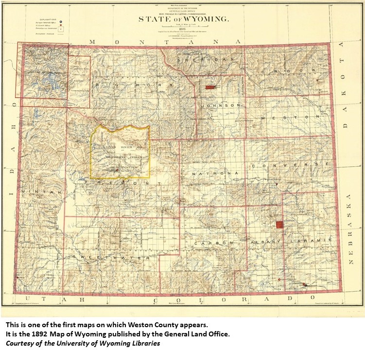 Named for a man prominent in building railroads in eastern and northern Wyoming. (Gannett, 1905) Named for Weston Harvey, who was instrumental in the railroad as it pushed its iron trail westward into Wyoming. Organized in 1890. County seat is in Newcastle. (WPA) Named for John B. Weston, whose activities and influence brought the railroad into that section of Wyoming. (Wyoming Historical Blue Book, 1946)