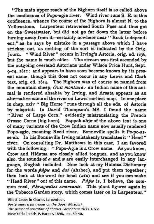 | When white men first came into the country, they found the three Popo Agie Rivers already named the Popo Agie, which is the main stream, the North branch of that river, and the Little Popo Agie, which is the south branch. Popo Agie is a Crow name, and like all Indian names has a direct and practical meaning. Popo signifies head, and Agie, water; therefore, these streams are so named because they get their water directly from the fountain head, the mountains. They are very beautiful mountain torrents and were highly prized by the Crows in their day in that country. (WPA) River, Fremont County, Wyo., formed by the junction of North and Middle Popo Agie Rivers ... and flowing easterly to unite with Winder River near the Wind River base line in R. 4 E., Wind River meridian, to form Big Horn River. (Decisions, 1916, 1932) |