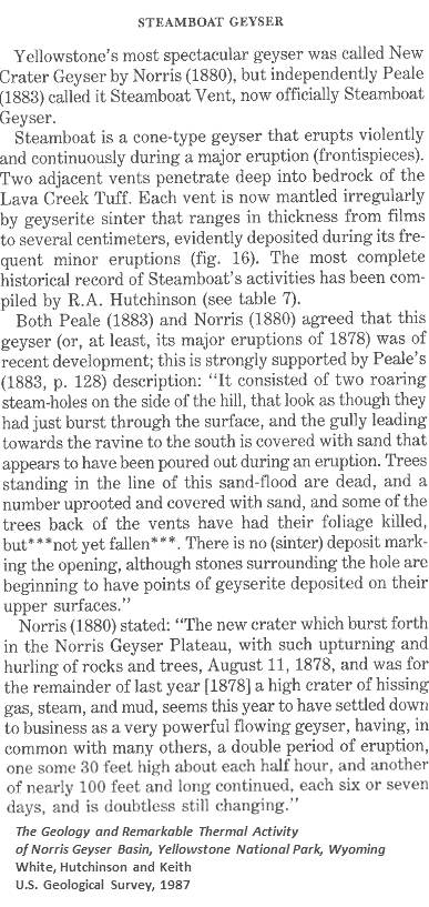 | Geyser in the Norris Basin called New Crater Geyser by Norris in 1880 and Steamboat Geyser by Peale in 1883. Presently known as Steamboat Geyser. (White, Hutchinson and Keith) |