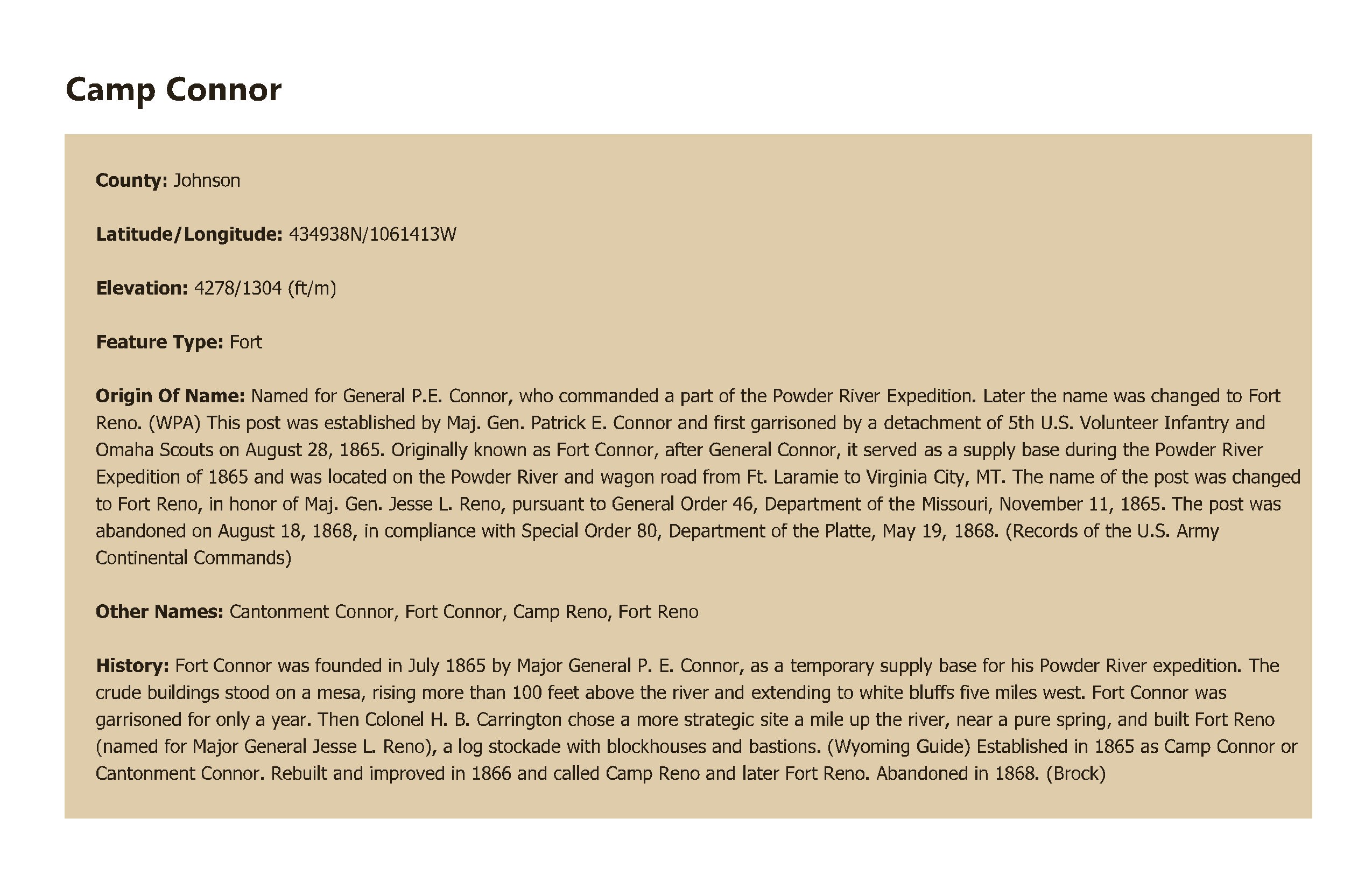 Named for General P.E. Connor, who commanded a part of the Powder River Expedition. Later the name was changed to Fort Reno. (WPA) This post was established by Maj. Gen. Patrick E. Connor and first garrisoned by a detachment of 5th U.S. Volunteer Infantry and Omaha Scouts on August 28, 1865. Originally known as Fort Connor, after General Connor, it served as a supply base during the Powder River Expedition of 1865 and was located on the Powder River and wagon road from Ft. Laramie to Virginia City, MT. The name of the post was changed to Fort Reno, in honor of Maj. Gen. Jesse L. Reno, pursuant to General Order 46, Department of the Missouri, November 11, 1865. The post was abandoned on August 18, 1868, in compliance with Special Order 80, Department of the Platte, May 19, 1868. (Records of the U.S. Army Continental Commands)