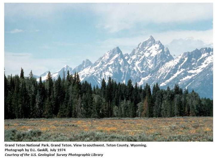 The highest point in the range from which it take its name. Named by the French trappers as early as 1811 from the fancied resemblance of these peaks, when seen from a distance, to the nipple of a human breast. In 1872 USGS rechristened the highest peak Mount Hayden. The new name never gained any local standing and although it has crept into many maps, its continued use ought to be discouraged. The name "Teton" was officially approved by Congress when, in the Act of February 26, 1929, it established the Grand Teton National Park. (WPA) The Three Tetons are the most noted historic peaks in the Rocky Mountains. The topography of the country is such that the highest peak, Grand Teton (13,691 feet) can be seen from a great distance and has long served as a landmark to trappers and pioneers. Unlike the mountains of that region, the Tetons are not hemmed in by foothills, but rise in bold relief from the surrounding plateau - the Grand Teton towering seven thousand feet above Jackson Lake, at its base. The range is but sixty miles long and lies some twenty-five miles southwest of Yellowstone Lake. It is crossed by Teton Pass, about twenty miles south of Grand Teton. (Thwaites) Captain William A. Jones in Report upon the reconnaissance of northwestern Wyoming ... 1873 "The culminating point of the Tetons has for a very long time been called the Grand Teton. It is a good name, and I see no reason for changing it, although some members of Dr. Hayden's party of 1872 have seen fit to rename it after him. I know of no man who is more worthy of having his name left behind him in the Rocky Mountains than he: but certainly, among the "thousand peaks worthy of a name" which he describes, along the western face of the Sierra Shoshone, some one might have been selected which would have gone down to posterity with a clearer title."