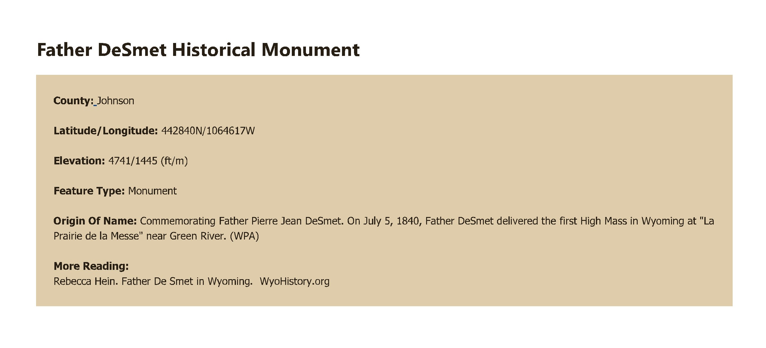 | Commemorating Father Pierre Jean DeSmet. On July 5, 1840, Father DeSmet delivered the first High Mass in Wyoming at "La Prairie de la Messe" near Green River. (WPA) |